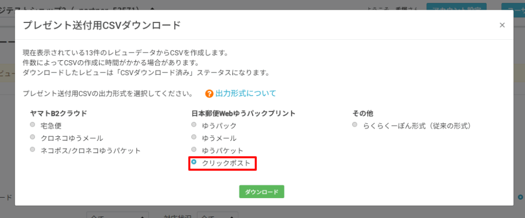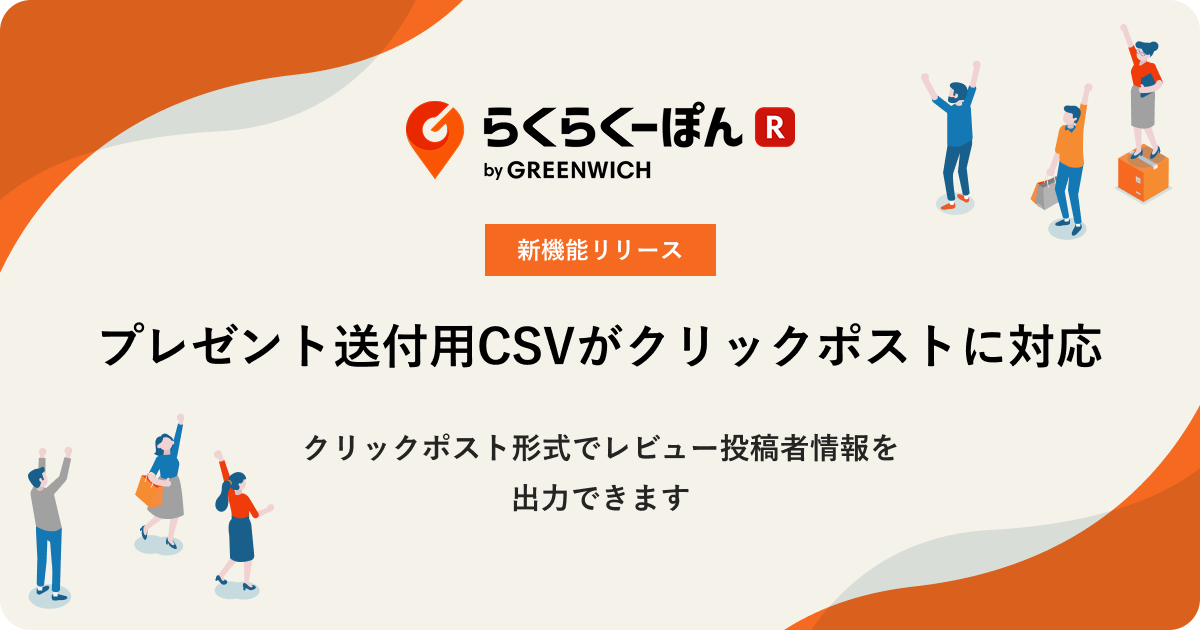 らくらくーぽんでは、レビュー投稿のお礼にプレゼントを送付している店舗向けの機能強化として、レビュー投稿者の情報をクリックポストまとめ申込形式でのCSV出力に対応しました。