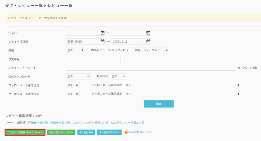 プレゼント対象のレビュー一覧を表示し、「プレゼント送付用CSVダウンロード」ボタンをクリックします。