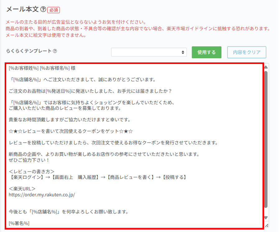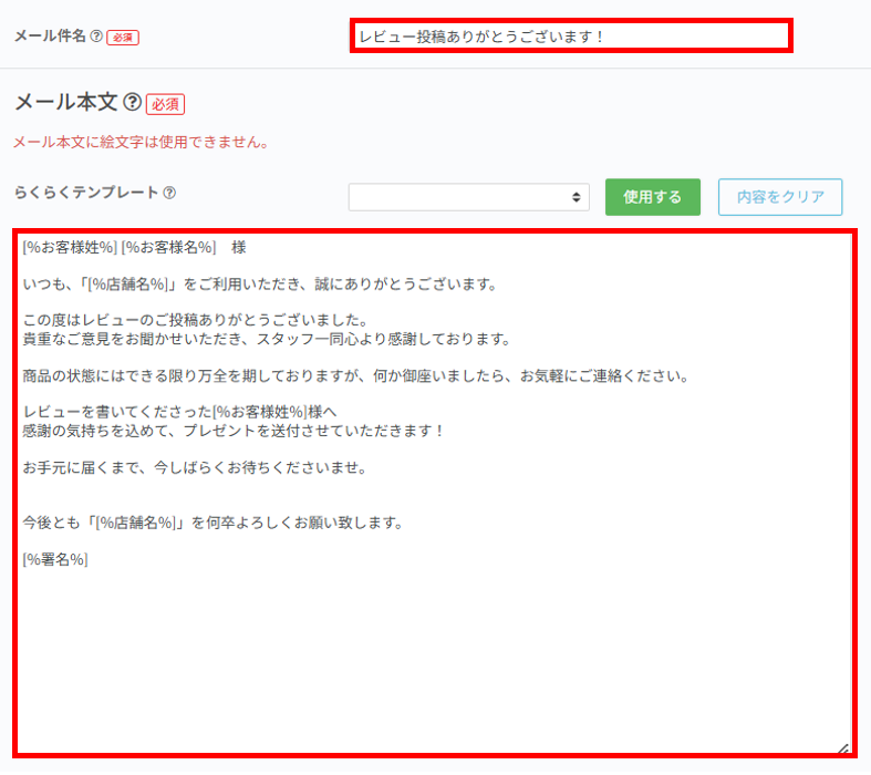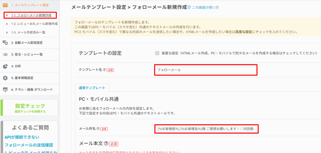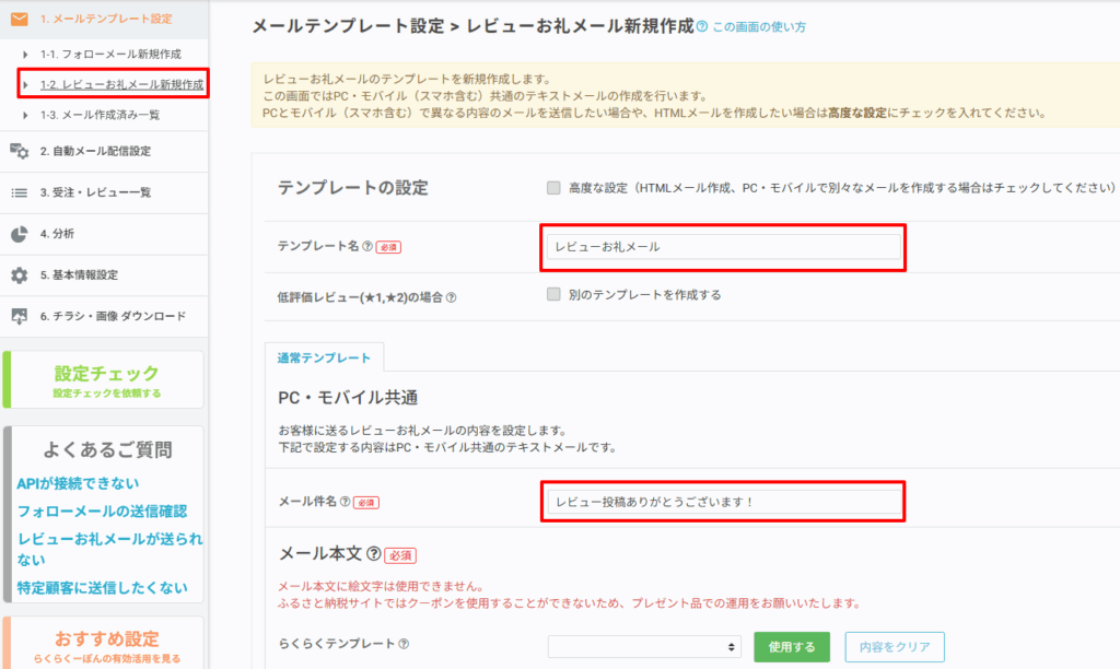 1.メールテンプレート設定 > 1-2.レビューお礼メール新規作成