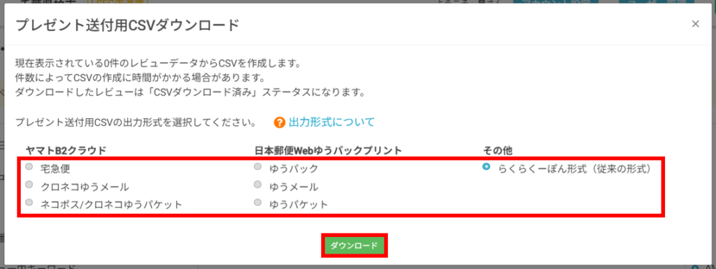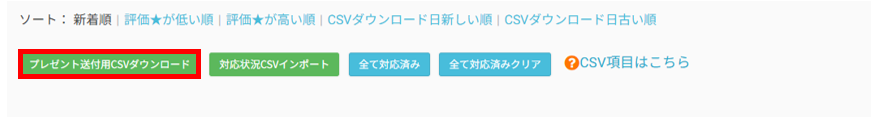 表示されているレビュー一覧から、レビュー投稿者に対してレビュー特典を別送するための、顧客情報リストのCSVが作成できます。