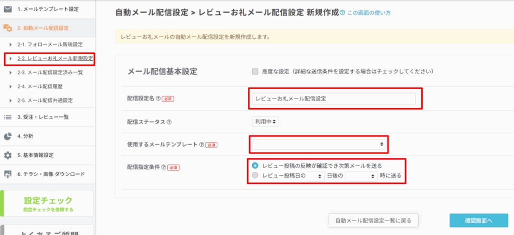 2.自動メール配信設定 > 2-2.レビューのお礼メール新規設定
