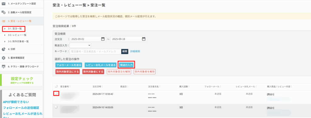 インポートが完了すると、モーダルが閉じ、受注一覧の対象の注文に発送日が表示されます。 これで発送日のCSVインポートは完了です。