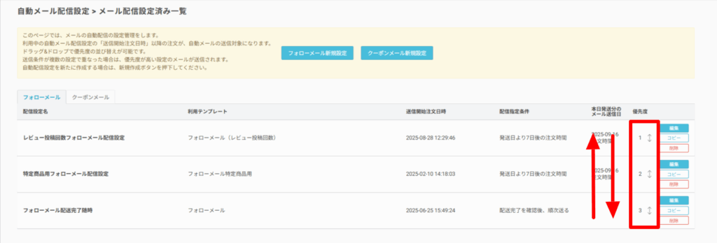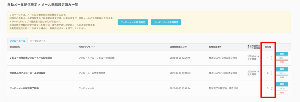 そのため、複数の配信設定が存在する場合、一覧に記載されている優先度を参照し、条件に該当する配信設定が1回のみ配信されます。