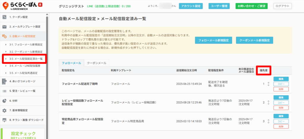 3.自動メール配信設定 > 3-3.メール配信設定済み一覧 を開きます。