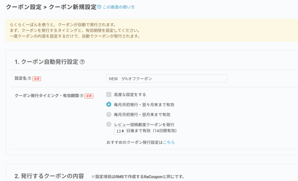 (もしくは、クーポン設定 >クーポン設定済み一覧>コピー から作成も可能です。)