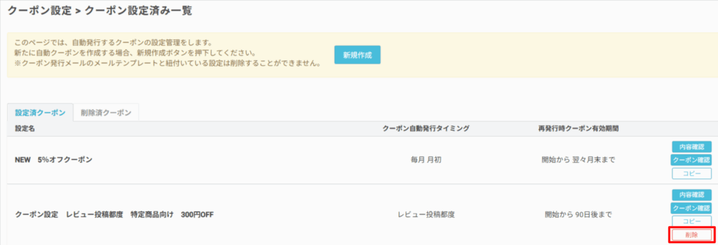 クーポンの自動発行設定の内容を変更するには、新しく自動発行設定を作成いただく必要がございます。