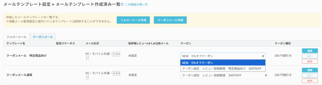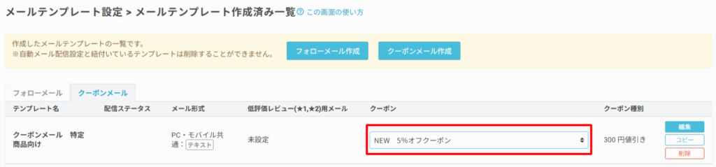 メールテンプレート設定 > メールテンプレート作成済み一覧>クーポンメールのタブ
