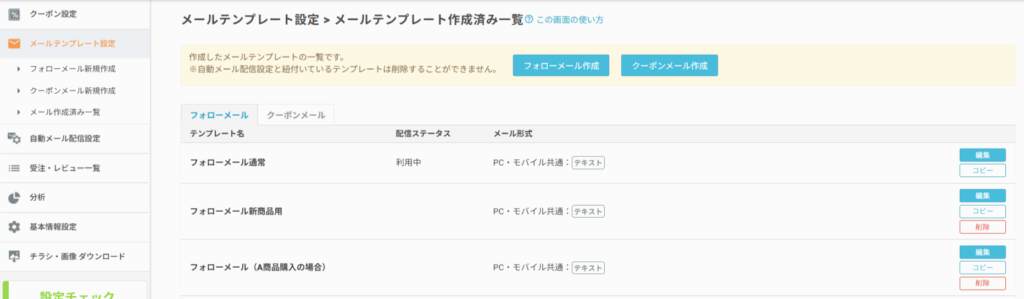 作成したフォローメール・クーポンメールテンプレート名です。