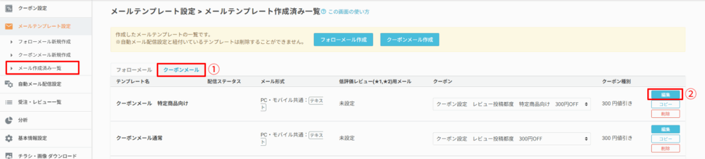 配信中のクーポンメールを編集する 2024.11.08 メールテンプレート設定 ■クーポンメールテンプレートの編集方法 現在配信しているクーポンメールの内容を編集したい場合は、メールテンプレート設定>メール作成済み一覧 を開きます。 ①クーポンメールタブが選択されていることを確認し、該当するメールテンプレートの②編集ボタンを押下し、編集画面を開きます。 編集が完了しましたら、確認画面へ>登録 を行い、編集内容を登録します。※クーポンメール配信設定にて利用中のテンプレートを編集した場合、次回のメール送信時から編集後の内容に切り替わります。