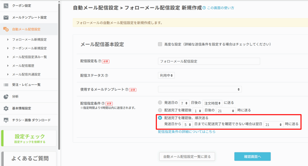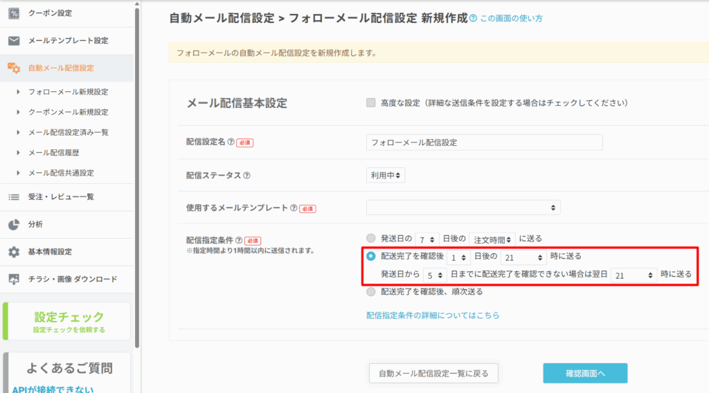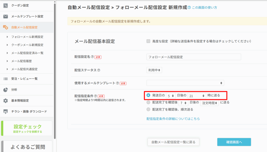 発送日から何日後の何時にフォローメールを送るかをそれぞれ選択します。