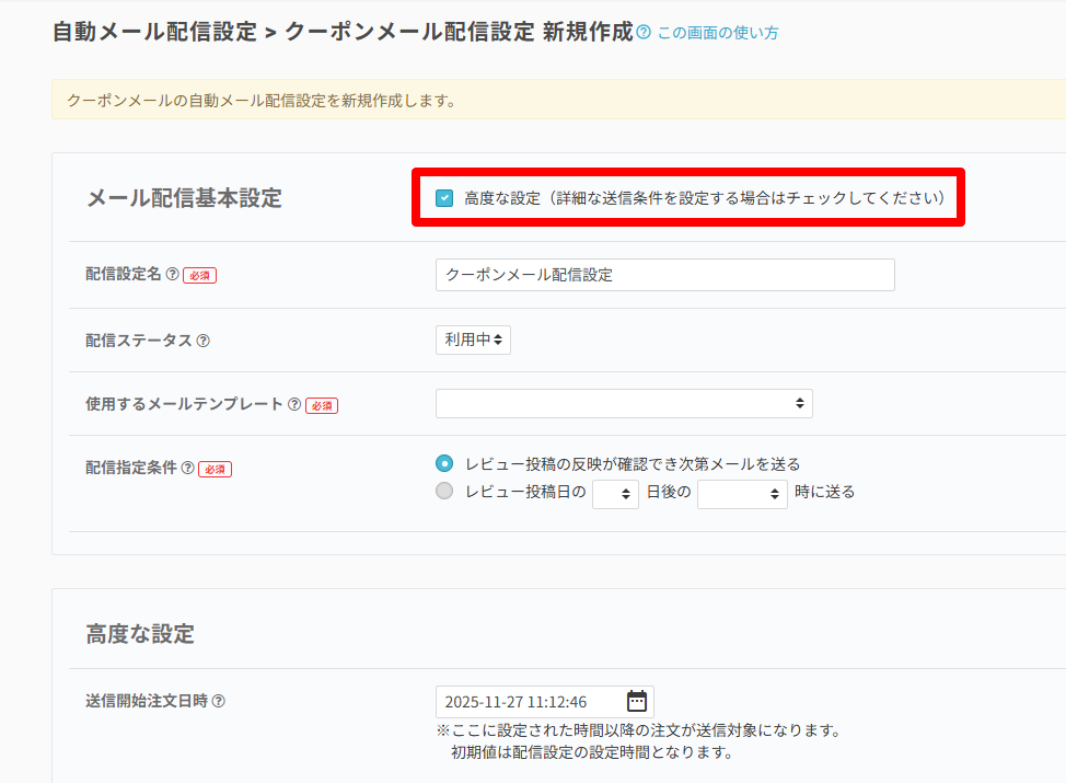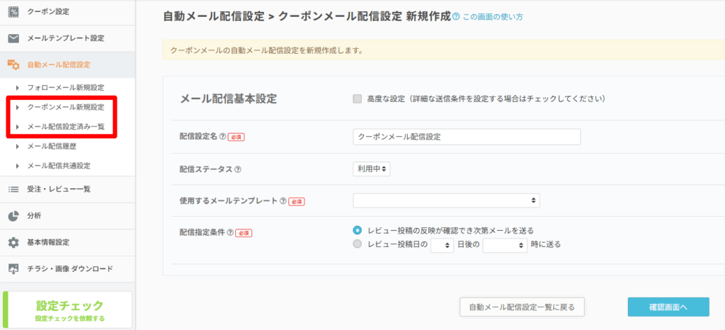 自動メール配信設定>クーポンメール新規設定 を開きます。