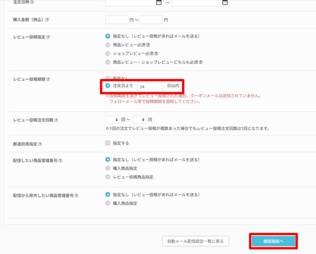 レビュー投稿期限の「注文日より●日以内」を選択し、日数を入力します。